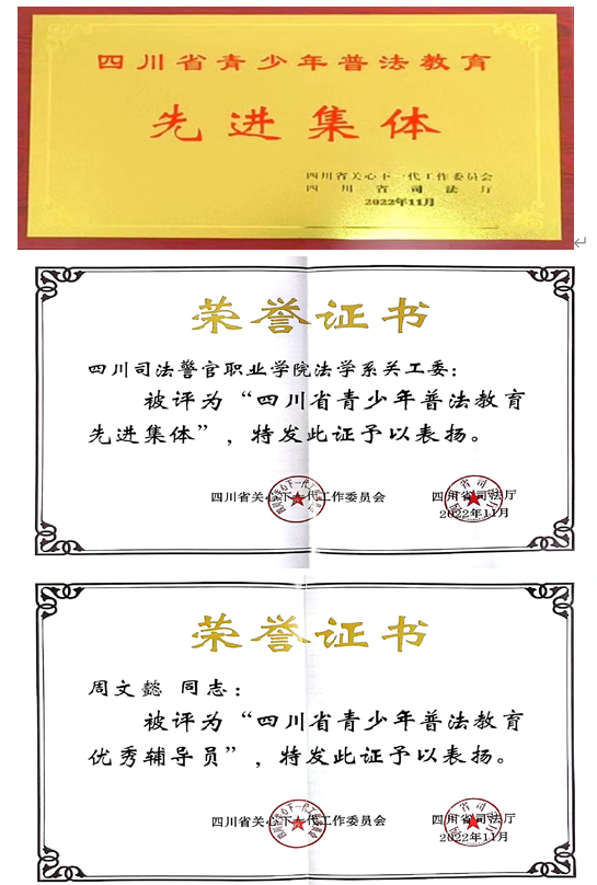 近日,四川省关心下一代工作委员会、四川省365bet线上娱乐_美好365app官方下载_皇冠365体育下载厅联合发布《关于通报表扬四川省青少年普法教育先进集体、先进个人和优秀辅导员的通知》,对在第四届“关爱明天、普法先行”青少年普法教育活动中取得突出成绩的集体和个人进行表彰,四川365bet线上娱乐_美好365app官方下载_皇冠365体育下载警官职业学院法学系关工委喜获“四川省青少年普法教育先进集体”殊荣,周文懿教师获评“四川省青少年普法教育优秀辅导员”。