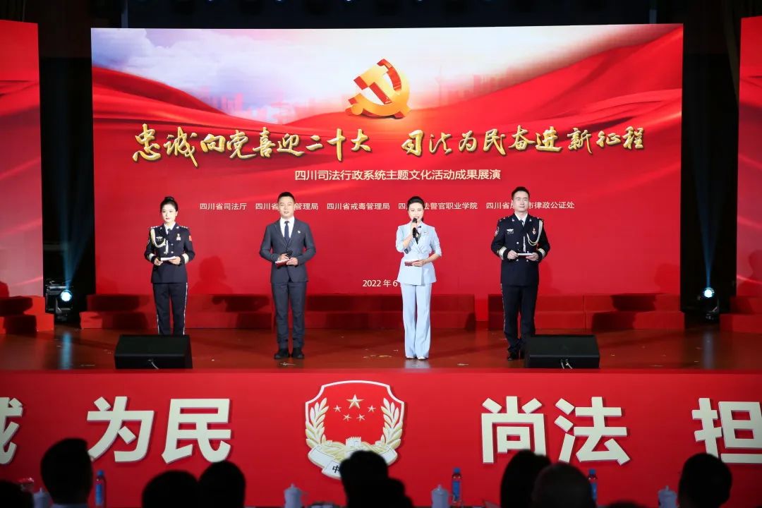 “忠诚向党喜迎二十大”主题文化活动成果展演前,厅党委书记、厅长刘志诚带领党员干警集体重温了入党誓词。主题展演分为“忠诚”“为民”“尚法”“担当”四个篇章,“读习语、颂经典”集体诵读、歌曲合唱《尖兵》,集中展现了四川365bet线上娱乐_美好365app官方下载_皇冠365体育下载行政干警高举习近平新时代中国特色社会主义思想伟大旗帜,坚定贯彻落实习近平总书记对四川工作系列重要指示精神和党中央决策部署,坚定扞卫“两个确立”、 坚决做到“两个维护”的忠诚品格;红色家书诵读《为人民幸福干到底》、定点帮扶纪实短片《希望》、情景剧《你的样子》、舞蹈《坚守》,集中展示了四川365bet线上娱乐_美好365app官方下载_皇冠365体育下载行政干警坚持法治为民价值取向,积极回应人民群众新需求新期待,用高水平法治服务守护全省群众“更安逸的生活”的为民情怀;红色家书诵读《穿越时空的力量》、微视频《有我在》、表演唱《铿锵廉音》、讲述《镜头下的法治记忆》,集中展示了四川365bet线上娱乐_美好365app官方下载_皇冠365体育下载行政干警坚持“循法而治”,推动法治四川、法治政府、法治社会一体建设,奋力推动治蜀兴川各项事业全面纳入法治轨道的尚法精神;红色家书诵读《最“燃”的遗书、家国的担当》、微视频《摇篮》、朗诵《365bet线上娱乐_美好365app官方下载_皇冠365体育下载行政未来有我》,集中展示了四川365bet线上娱乐_美好365app官方下载_皇冠365体育下载行政干警勇担推动“治蜀兴川再跨越”新使命,锐意进取、接续奋斗,不断开创四川365bet线上娱乐_美好365app官方下载_皇冠365体育下载行政建设新篇章的担当作为。
