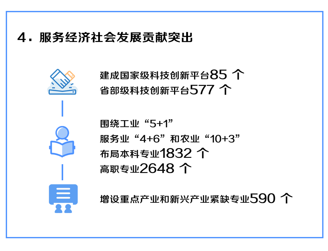 坚持抓融合、促贡献,高校科研服务经济社会成效明显,建成国家级科技创新平台85个、省部级科技创新平台567个;高校科技成果在本地实现转化的合同金额占转化总量80%,就地转化率居全国第二位;率先开展职务科技成果权属混合所有制改革试点,相关经验被国务院推广。专业布局更加紧密服务产业发展,围绕工业“5+1”、服务业“4+6”和农业“10+3”,布局本科专业1832个、高职专业2648个;深化产教融合、校企合作,增设重点产业和新兴产业紧缺专业590个。教育协同助力成渝地区双城经济圈建设成效显着,与重庆市教委签署教育协同发展合作框架协议7个,设立29个行业性、区域性联盟;共同实施支持广安、雅安、宜宾教育发展的举措,共同解决两省(市)随迁子女入学9万余人;共同推进研究院建设,助力经济社会发展。
