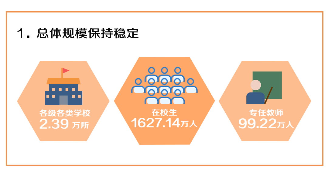 党的十八大以来,四川坚定以习近平新时代中国特色社会主义思想为指导,深入学习贯彻习近平总书记关于教育的重要论述和来川视察重要指示精神,坚决落实党中央、国务院和教育部决策部署,坚持优先发展教育事业,纵深推进教育改革,加快推进教育现代化,建设教育强省、办好人民满意的教育,为推动治蜀兴川再上新台阶贡献了教育力量。四川现有各级各类学校2.39万所,在校生1627.14万人,专任教师99.22万人。