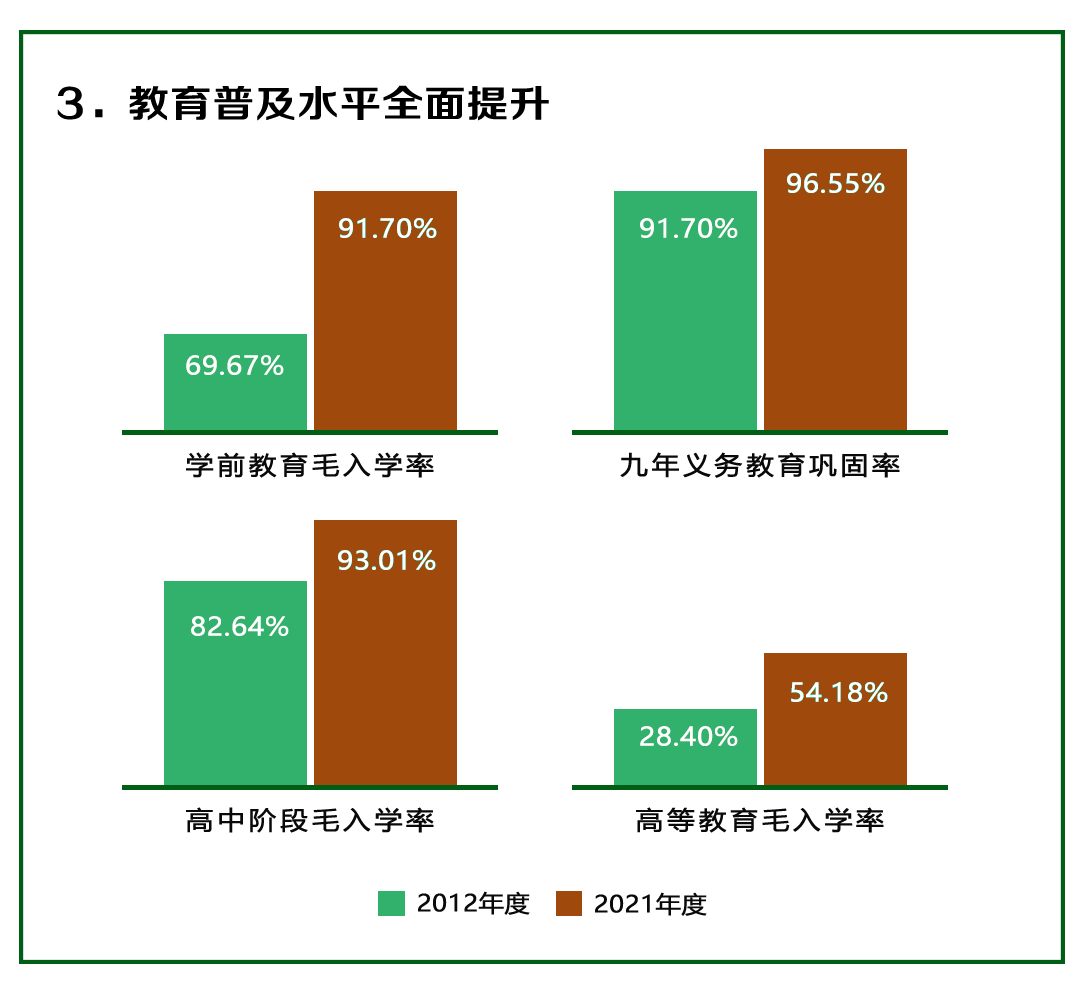 坚持抓改革、促活力,“双规范”“双减”工作取得阶段性成效,规范民办义务教育发展。落实“双减”政策,全省义务教育阶段营利性学科类培训机构压减率达100%,全省课后服务实现义务教育阶段学校和有需要的学生全覆盖,参与学生698万名,学生和家长满意度均超过97.5%。高考综合改革顺利平稳启动,稳妥推进高考加分改革,完善普通高中学业水平考试制度,健全普通高中综合素质评价制度,深化高等职业教育分类考试招生改革,“两依据一参考”评价导向正逐步确立。大力改善县域普通高中办学条件,“大校额”“大班额”得到有效化解。基础教育学校布局进一步优化调整,优化调整学校2211所、教学点2257个,办学集约化规模化效益初显;推进依托片区划分学区,深化学区制治理改革,缩小校际教育差距,促进区域教育优质均衡发展。