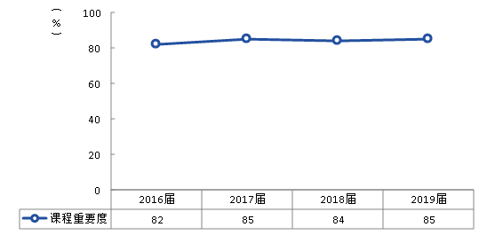 2019届毕业生从事专业相关工作毕业生对核心课程的重要度评价为85%,对核心课程的满足度评价为84%,核心知识达成度为91%,学院四年数据显示,核心课程的重要度、核心课程满足度与核心知识达成度均整体呈上升趋势,核心课程培养效果有所提升。