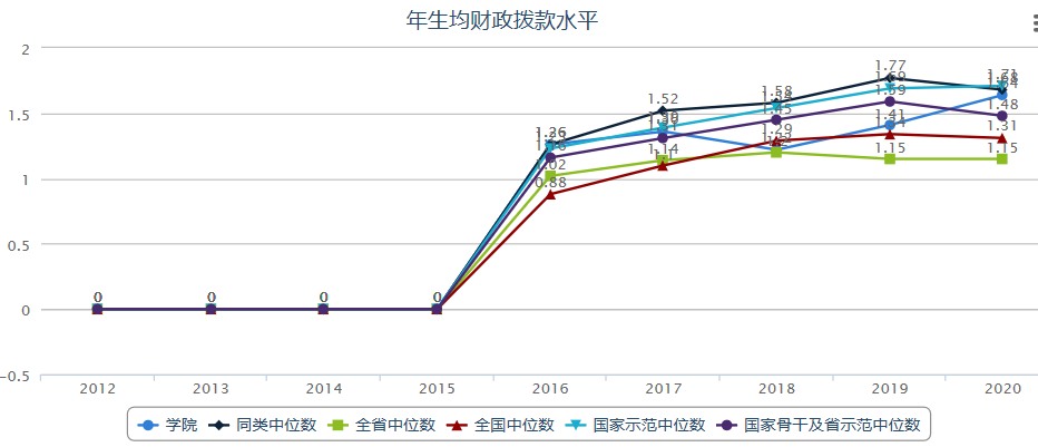 学院为省财政厅二级预算单位,办学经费由省财政厅足额保障。学院办学经费主要构成:财政预算内经费、学费收入、中央奖补资金和短期培训收入。学院生均财政拨款高于全国平均(见图5-1,图5-2)。